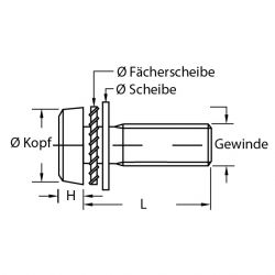 | Art.-Nr. | Gewindegröße | L (mm) | Ø Kopf (mm) | H (mm) | Ø Fächerscheibe (mm) | Ø Scheibe (mm) | Datenblatt | |