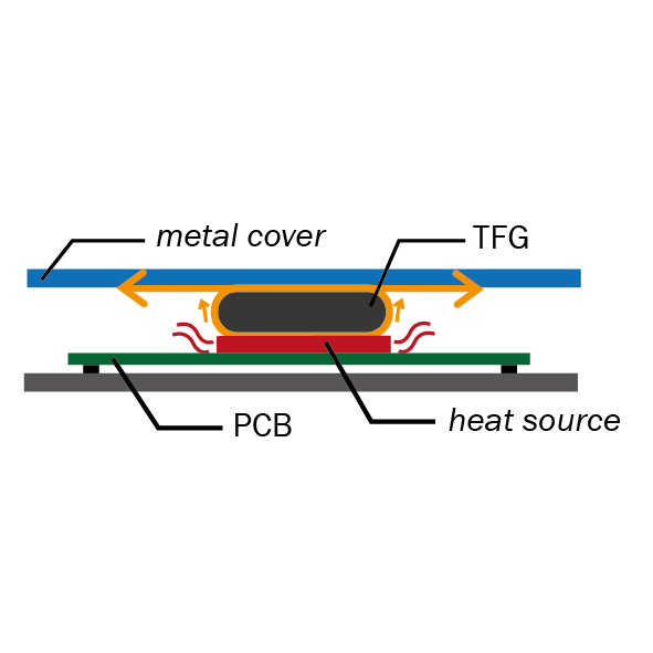 · Wärmeableitung von der Wärmequelle zum Kühlkörper oder Metallrahmen · Temperatursenkung durch Wärmestreuung · TFG muss 10-15% größer gewählt werden als die lichte Höhe der beiden zu kontaktierenden Bauteile.